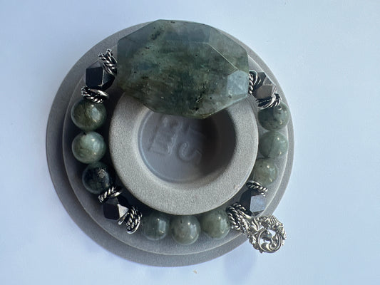 Gemstone Bracelet with Center Stone/ Black and White Brachiated Quartz