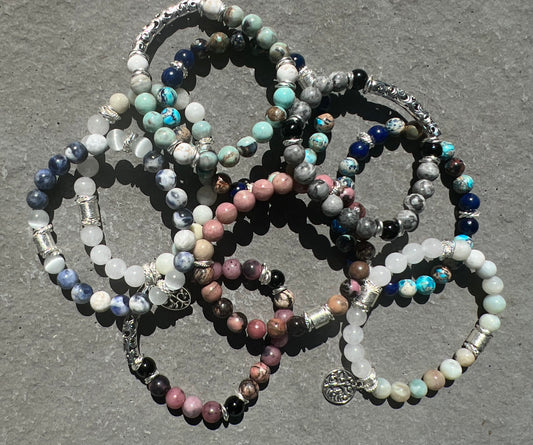 Gemstone Bracelet/10MM Gray Agate and Black Labradorite (Larvikite) with Tree of Life Charm