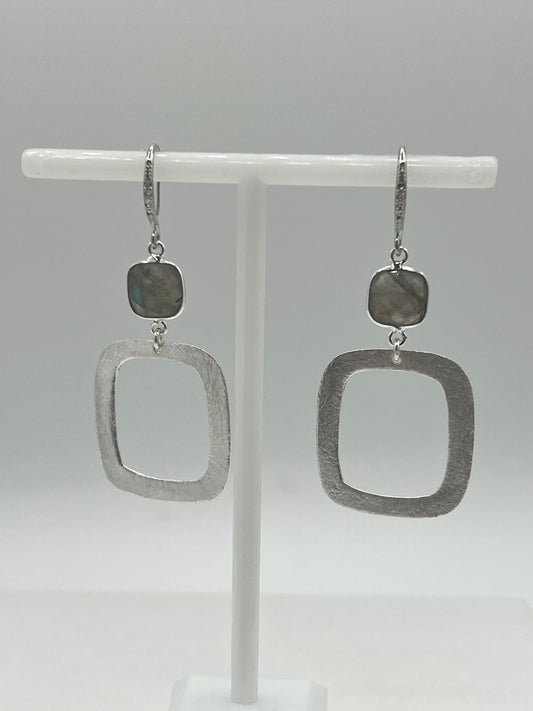 Silver Gemstone Earring with Cushion Shape Labradorite Stone and Square brushed Silver Charm