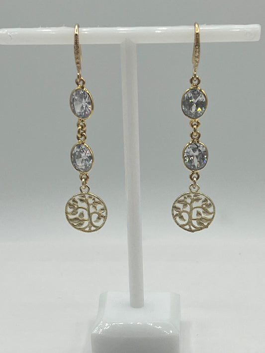 Gold Gemstone Earring wih 2 CZs and Brushed Gold Tree of Life Charm.