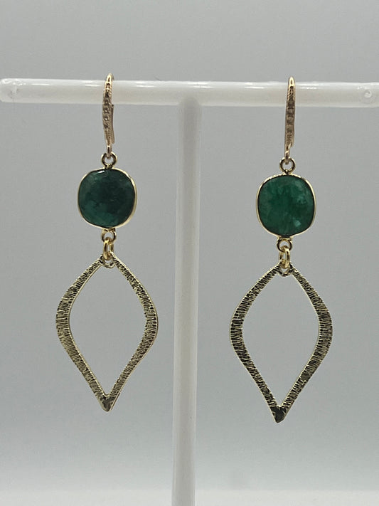 Gold Gemstone Earring with Emerald Cushion Stone and Gold Marquise Charm