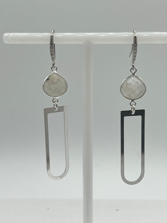 Silver Gemstone Earrings with 13 mm Rainbow Moonstone and U Shaped Charm