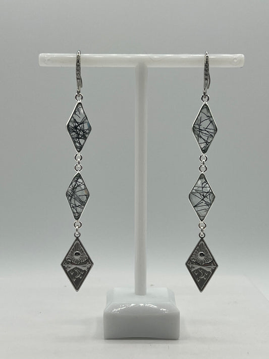 Silver Gemstone Earring, Double Diamond Black Rutile with Diamond Tarot Charm