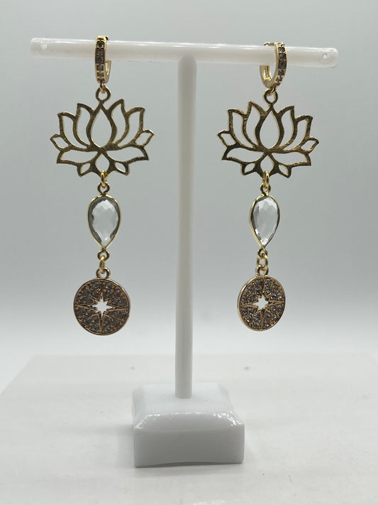 Gold Gemstone Earring with Large Gold Lotus, Crystal Pear and Pave Star Charm