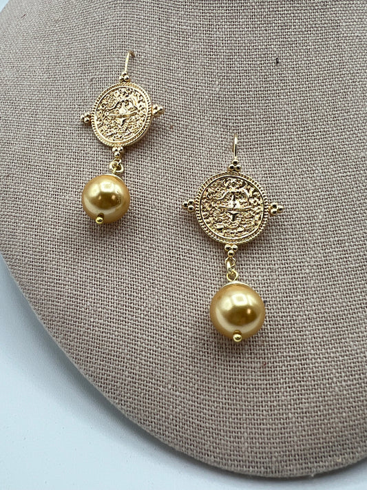 Gemstone Earring with Gold Medallion Gold Shell Pearl