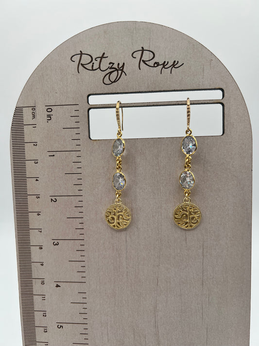 Gold Gemstone Earring wih 2 CZs and Brushed Gold Tree of Life Charm