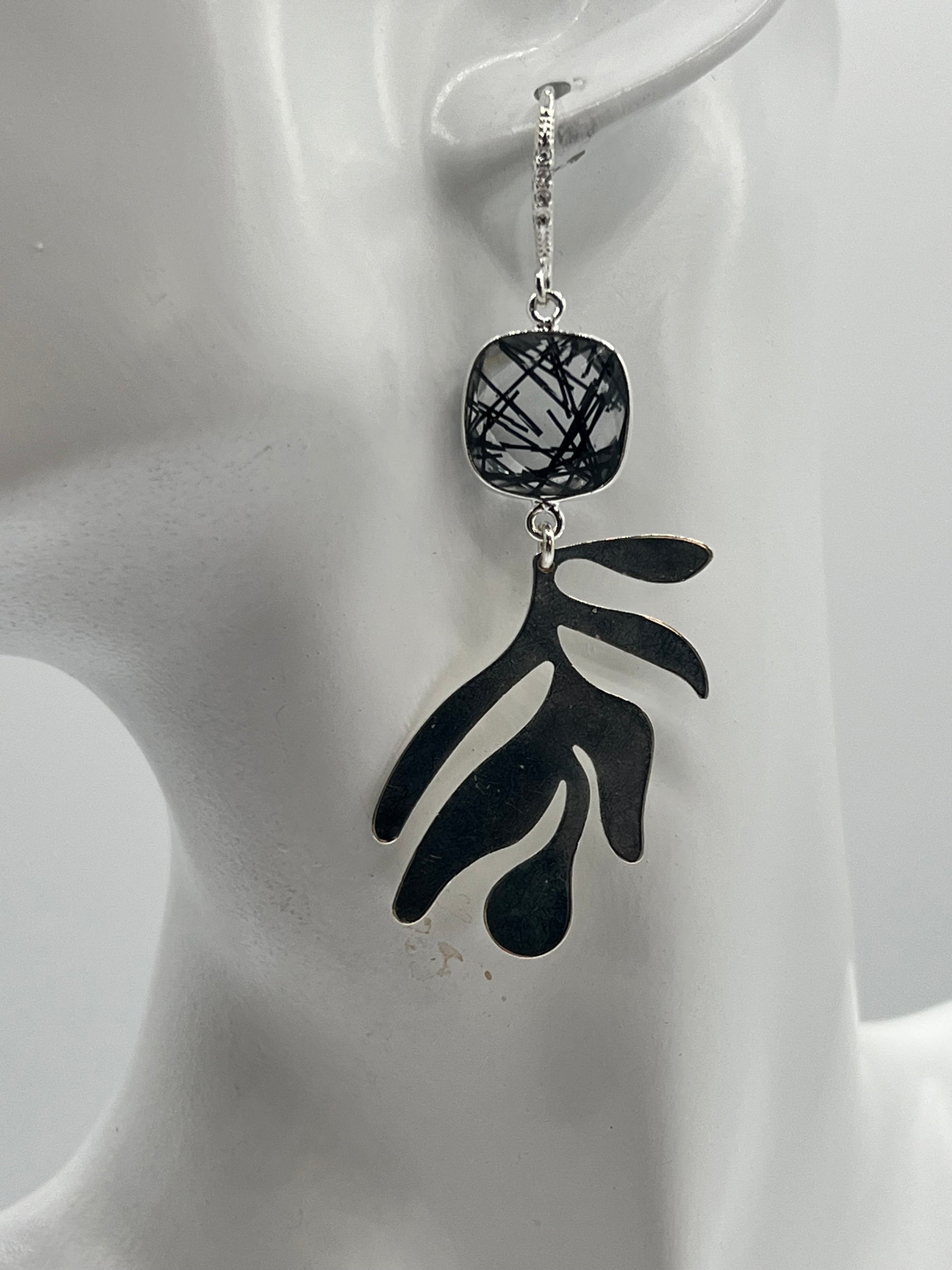 Silver Gemstone Earring, Black Rutile Cushion Cut Stone with Large Polished Silver Leaf Charm