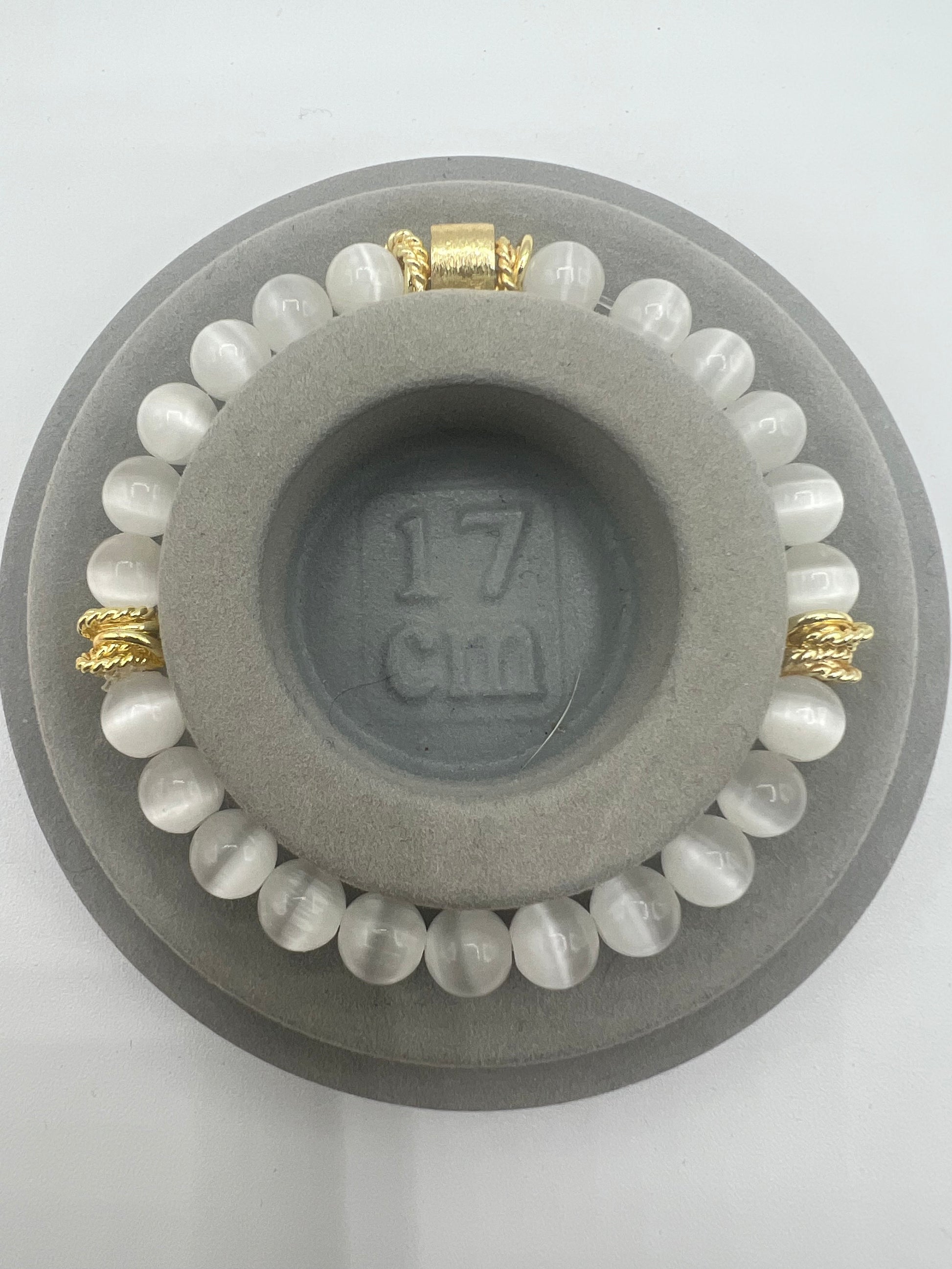 This gemstone bracelet is made with 8 MM White Cat's Eye beads and is accented with brushed gold.