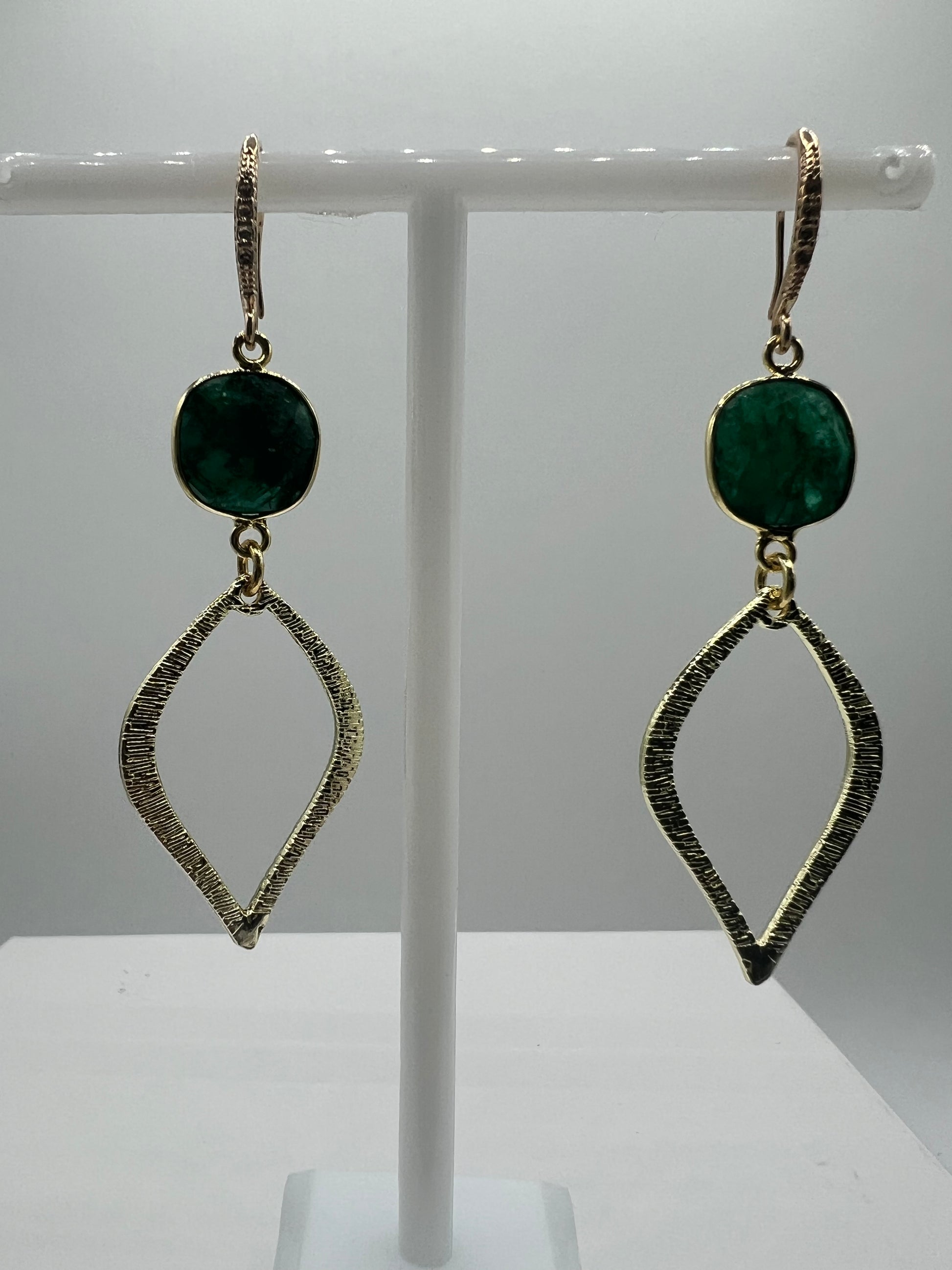 Gemstone Earring- These Earrings are made with a Beautiful Cushion Cut Emerald Stone accented with Brushed Gold Marquise shaped Charms. Any Ritzy Roxx Earring can be made with wires or posts upon request at no extra charge. There is a $5 up charge for pave huggies. Most pieces are available in gold or silver. Just message us with your special request!