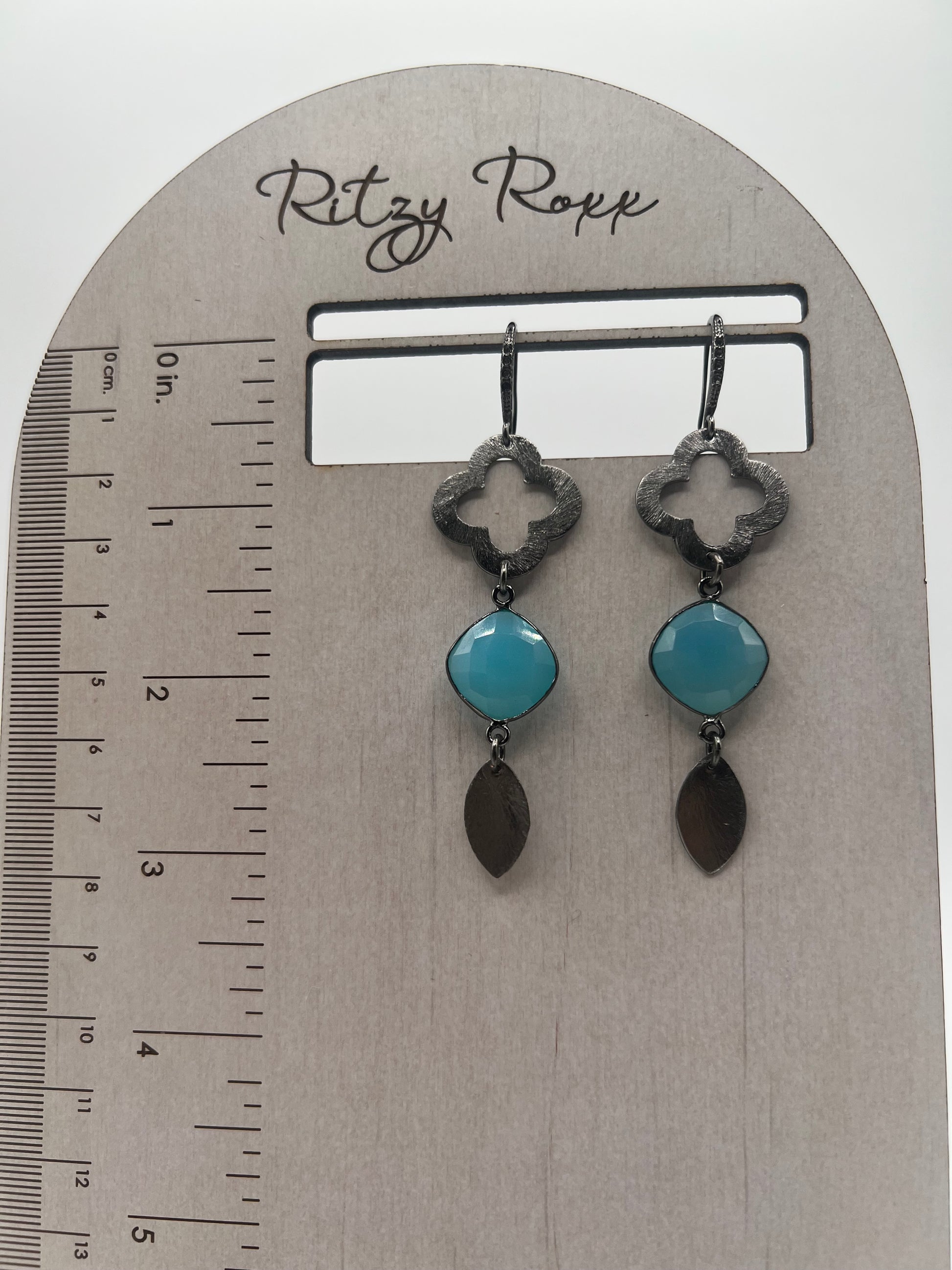 Gemstone Earring- These Earrings are made with a Beautiful Bezel Set Marquise Cut Chalcedony Stone accented with Gunmetal Clover and Marquise Shaped Charms. Any Ritzy Roxx Earring can be made with wires or posts upon request at no extra charge. There is a $5 up charge for pave huggies. Most pieces are available in gold or silver. Just message us with your special request!