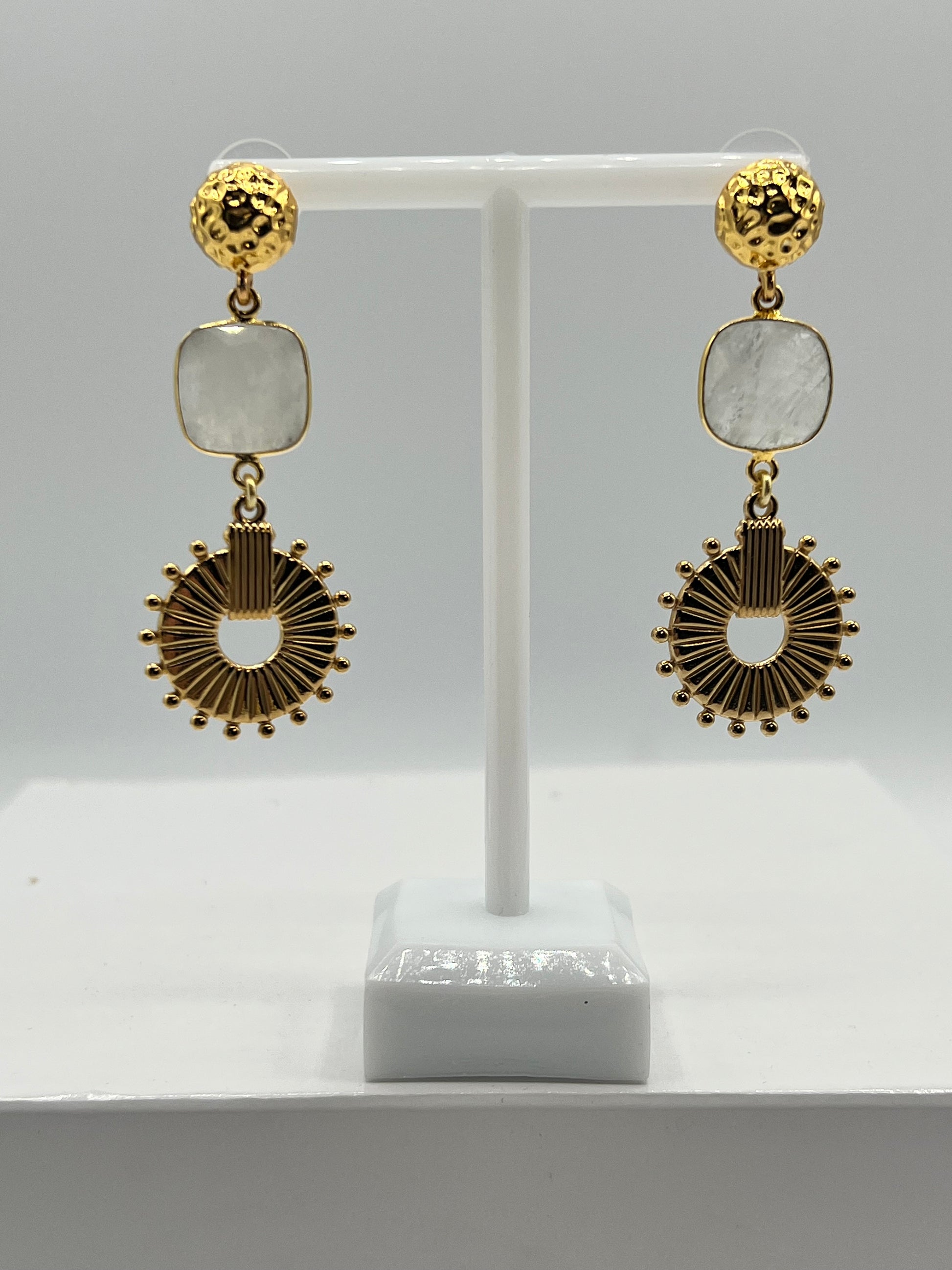 Gemstone Earring /Rainbow Moonstone 15MM Cushion Cut/ Gold Medallion