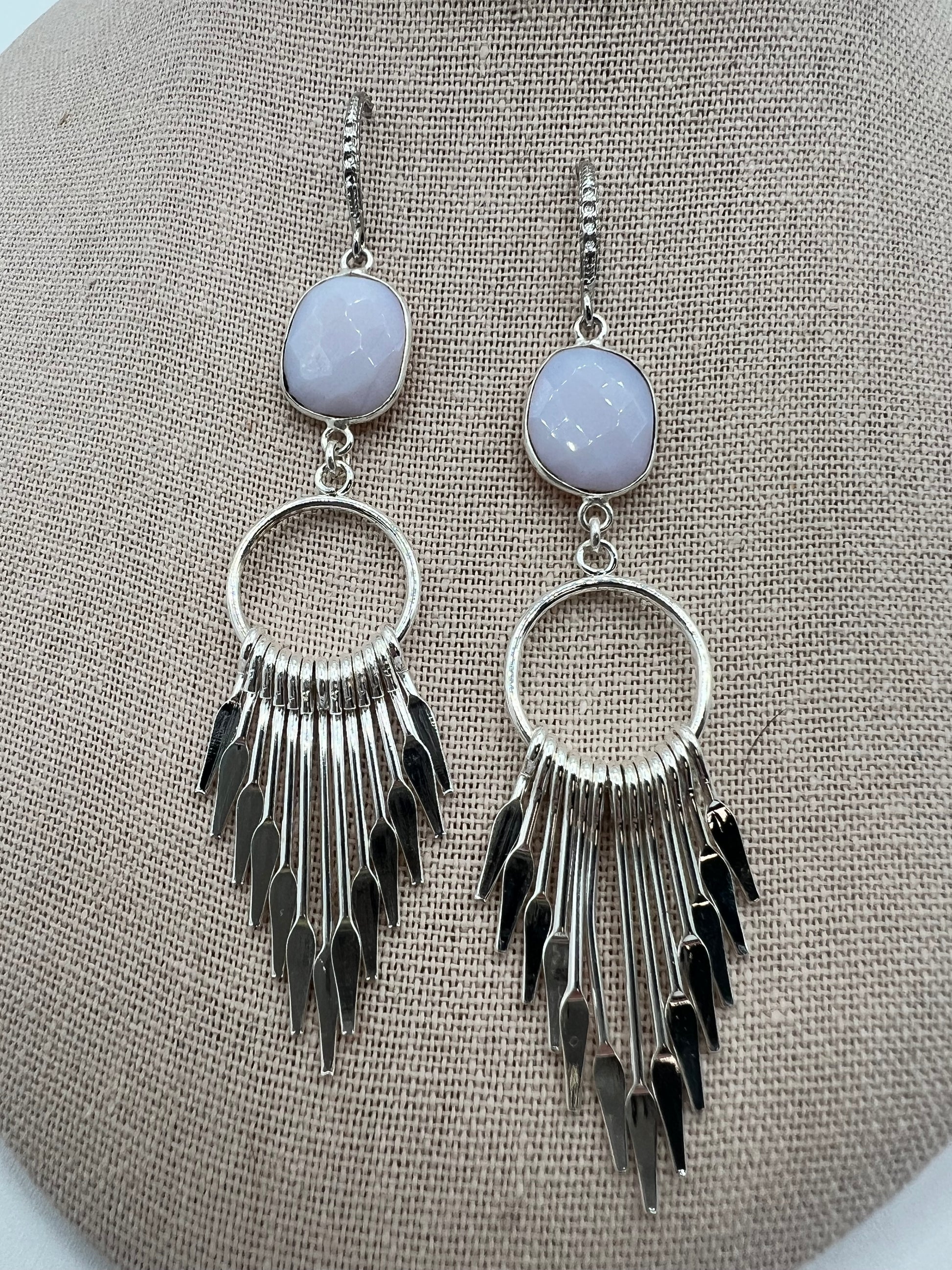 Gemstone Earring with Bezel Set Opalite with large silver tassel