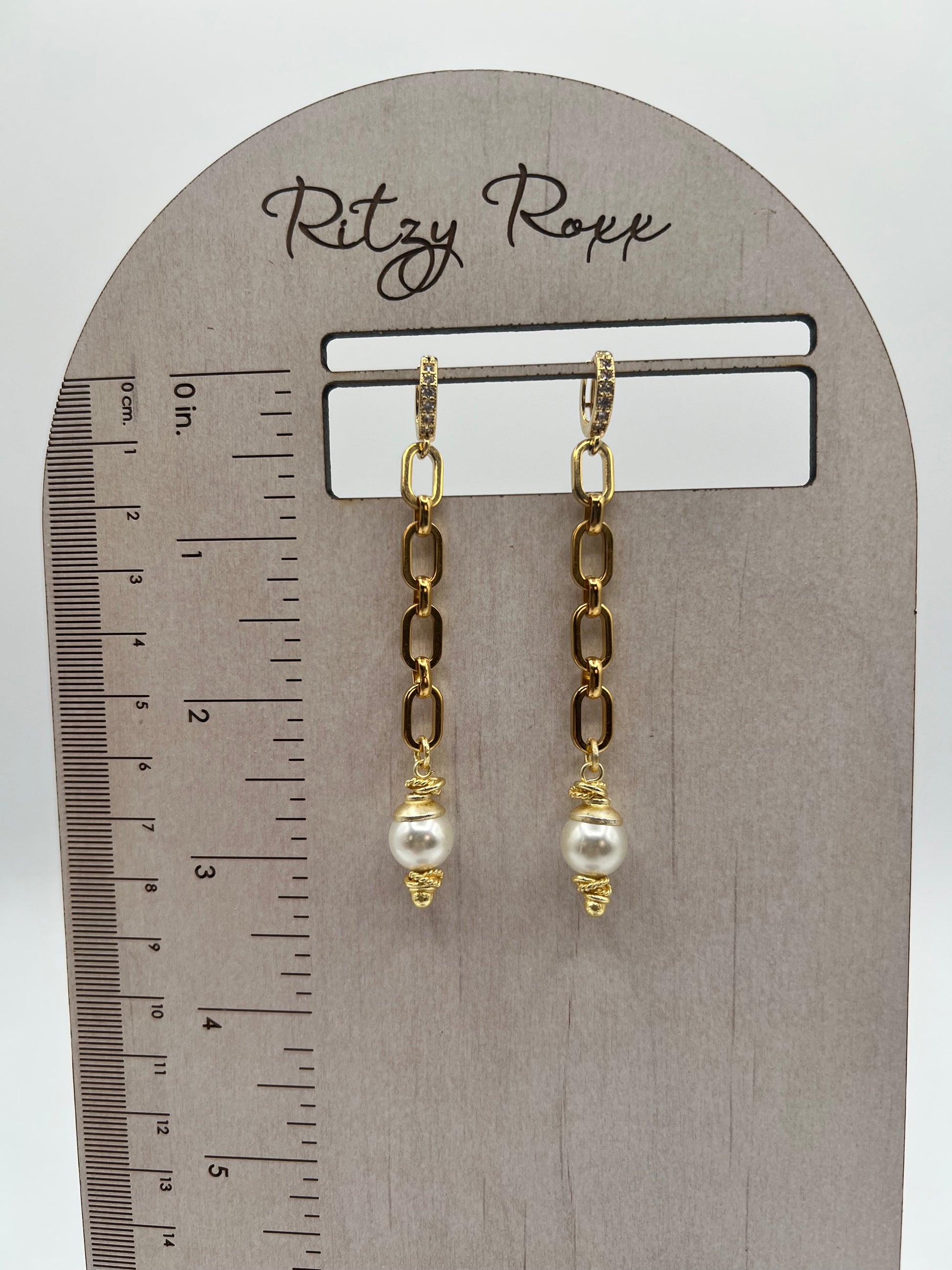 Gemstone Earring with Gold Chain and White Shell Pearl (pave huggie earring style)