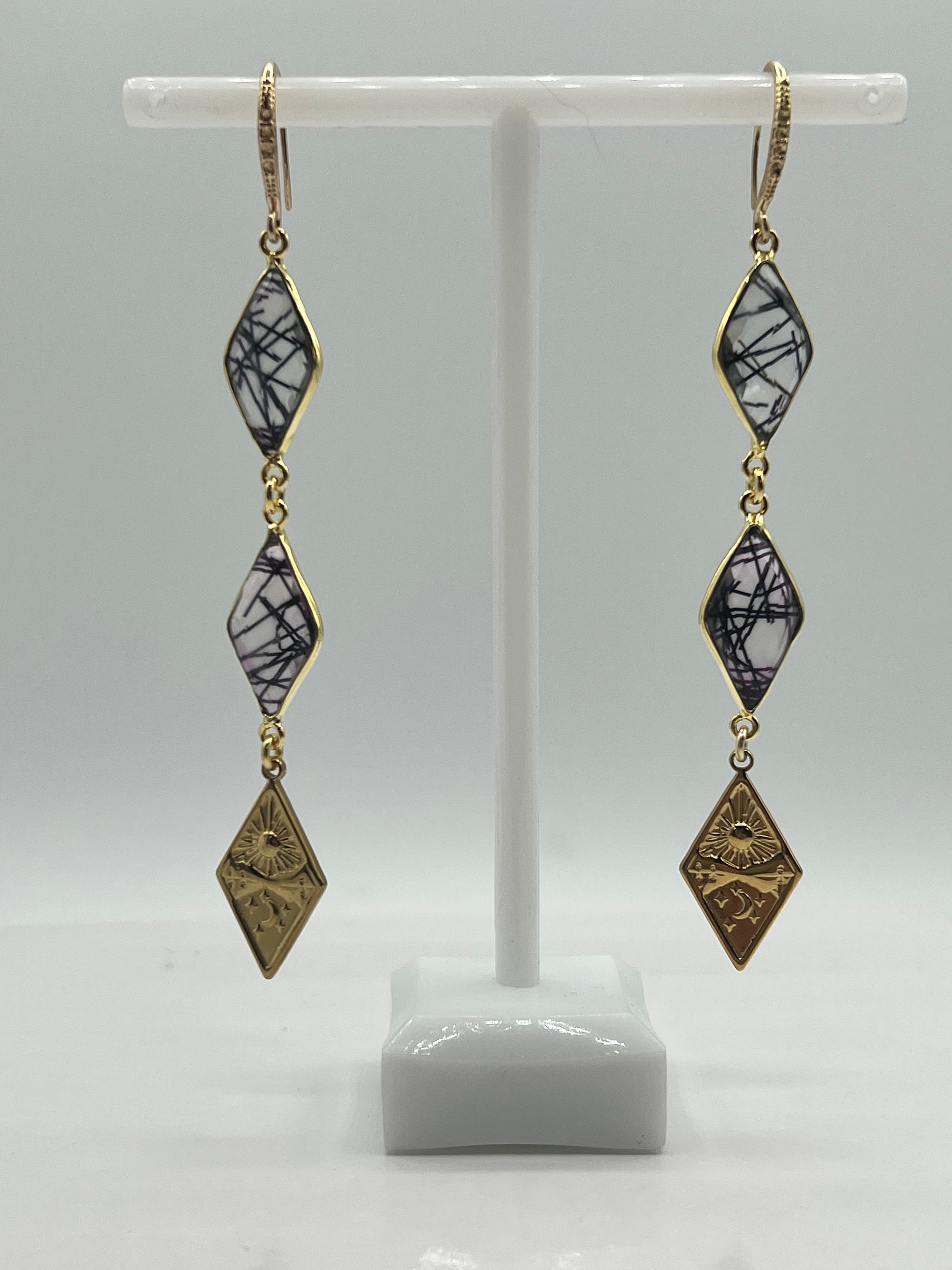 Gold Gemstone Earring, Double Diamond Black Rutile with Diamond Tarot Charm