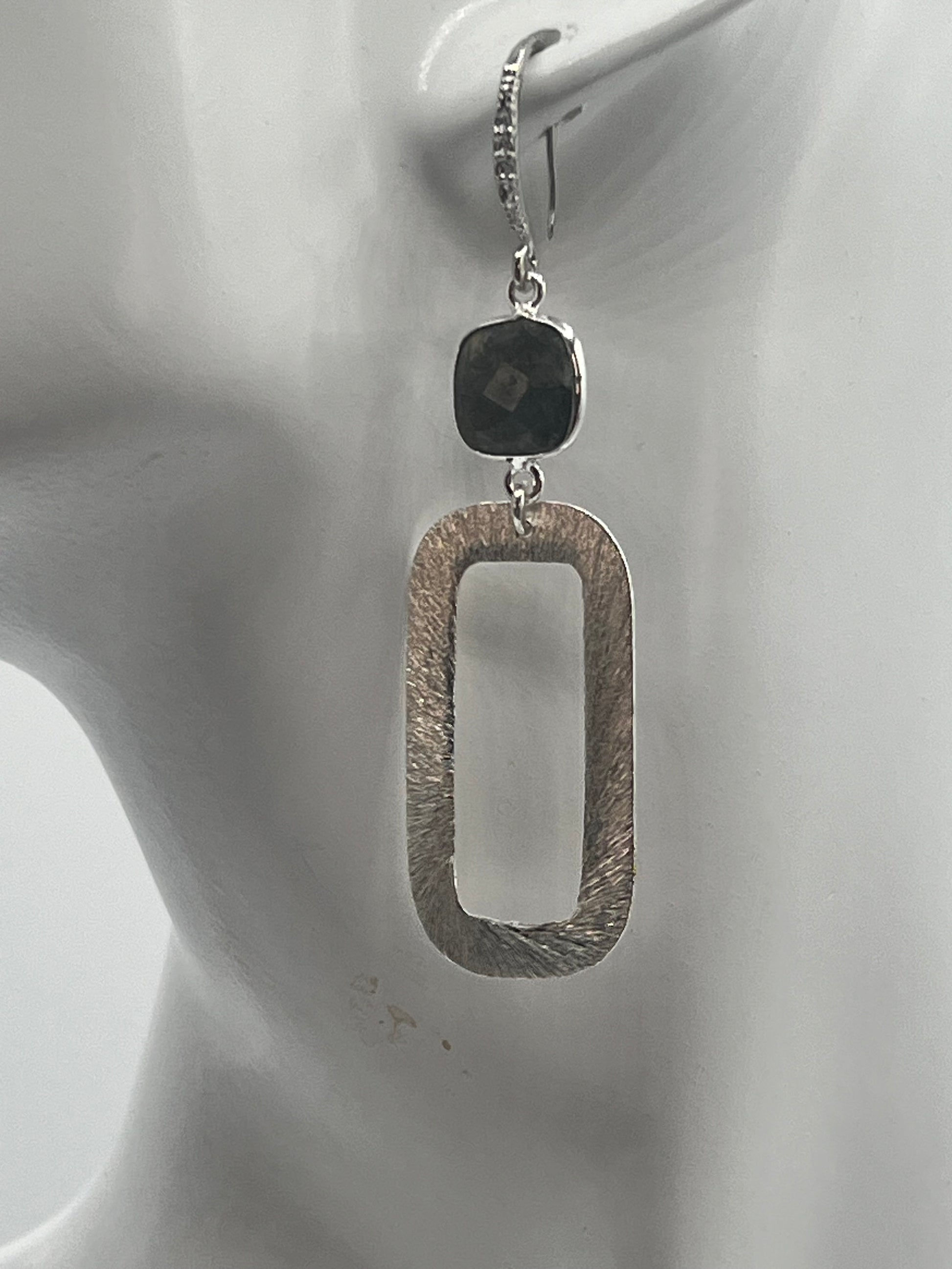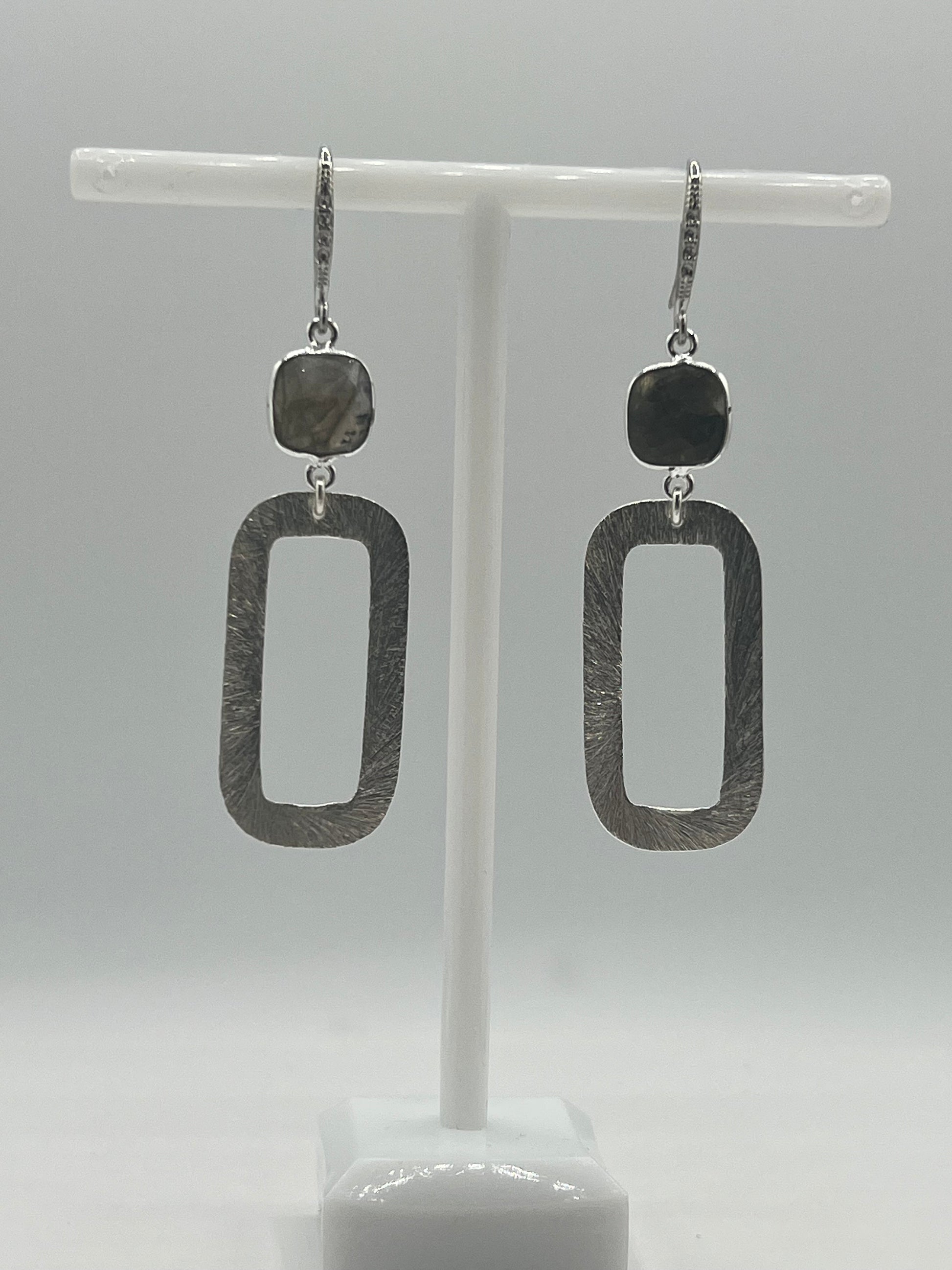 Silver Gemstone Earring with Cushion Shape Labradorite Stone and Long Rectangle brushed Silver Charm