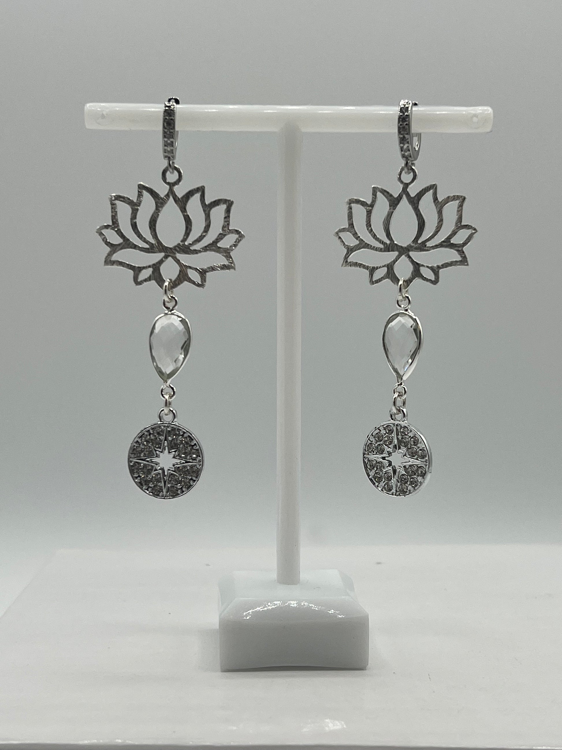 Silver Gemstone Earring with Large Silver Lotus, Crystal Pear and Pave Star Charm
